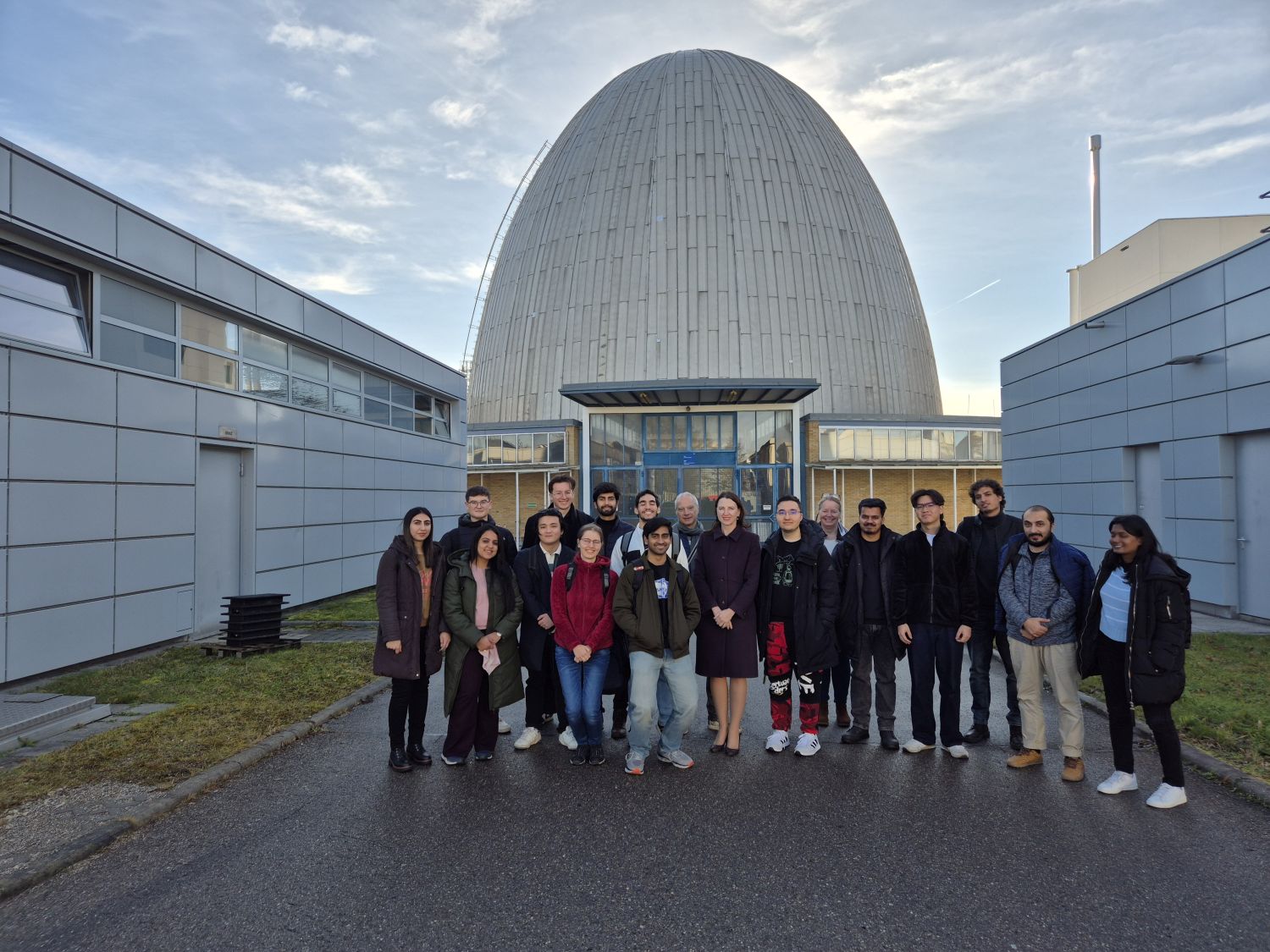Bild (TUM/FRM II): Die Studierenden mit Prof. Dr. Helena Liebelt (Mitte) und der Fakultätsmitarbeitenden Antje Fischer (hinten, rechts.) vor dem Vorgänger des FRM II, dem Forschungsreaktor München, auch „Atomei“ genannt.