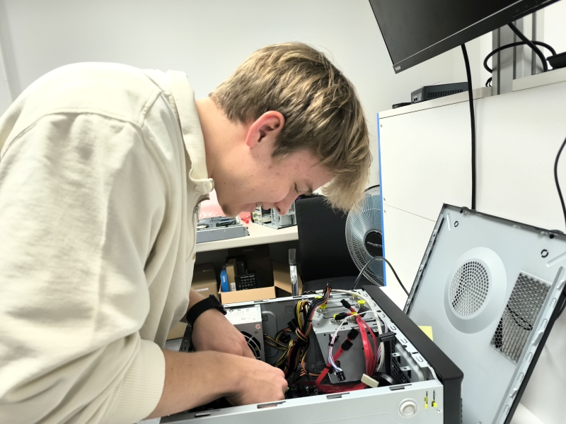 Der teilnehmende Schüler Lukas Friedl schildert im Folgenden seine persönlichen Eindrücke von einem Workshop, der eindrucksvoll gezeigt hat, wie spannend und zukunftsweisend Informatik sein kann: „Wir durften die einzelnen Komponenten eines Computers selbst in die Hand nehmen und Schritt für Schritt zusammenbauen. Nachdem das Mainboard bereits im Gehäuse verbaut war, haben wir unter Anleitung beispielsweise die Grafikkarte eingesetzt, die SSD montiert, das Netzteil angeschlossen und die Kabel sauber verbunden. Dabei haben wir nicht nur gesehen, wie die Teile aussehen, sondern direkt verstanden, wie sie zusammenspielen und worauf man beim Einbau achten muss. Es war spannend, den eigenen PC Stück für Stück entstehen zu sehen und am Ende ein funktionsfähiges System vor sich zu haben. Zum Abschluss konnten wir außerdem einen Raum besichtigen, in dem künftig Dozierende der THD gemeinsam mit Studierenden ein wassergekühltes Rechenzentrum aufbauen werden. Dort wurde uns erklärt, wie mehrere leistungsstarke Rechner und Server zusammengeschaltet werden und warum Kühlung bei hoher Rechenleistung eine zentrale Rolle spielt.“