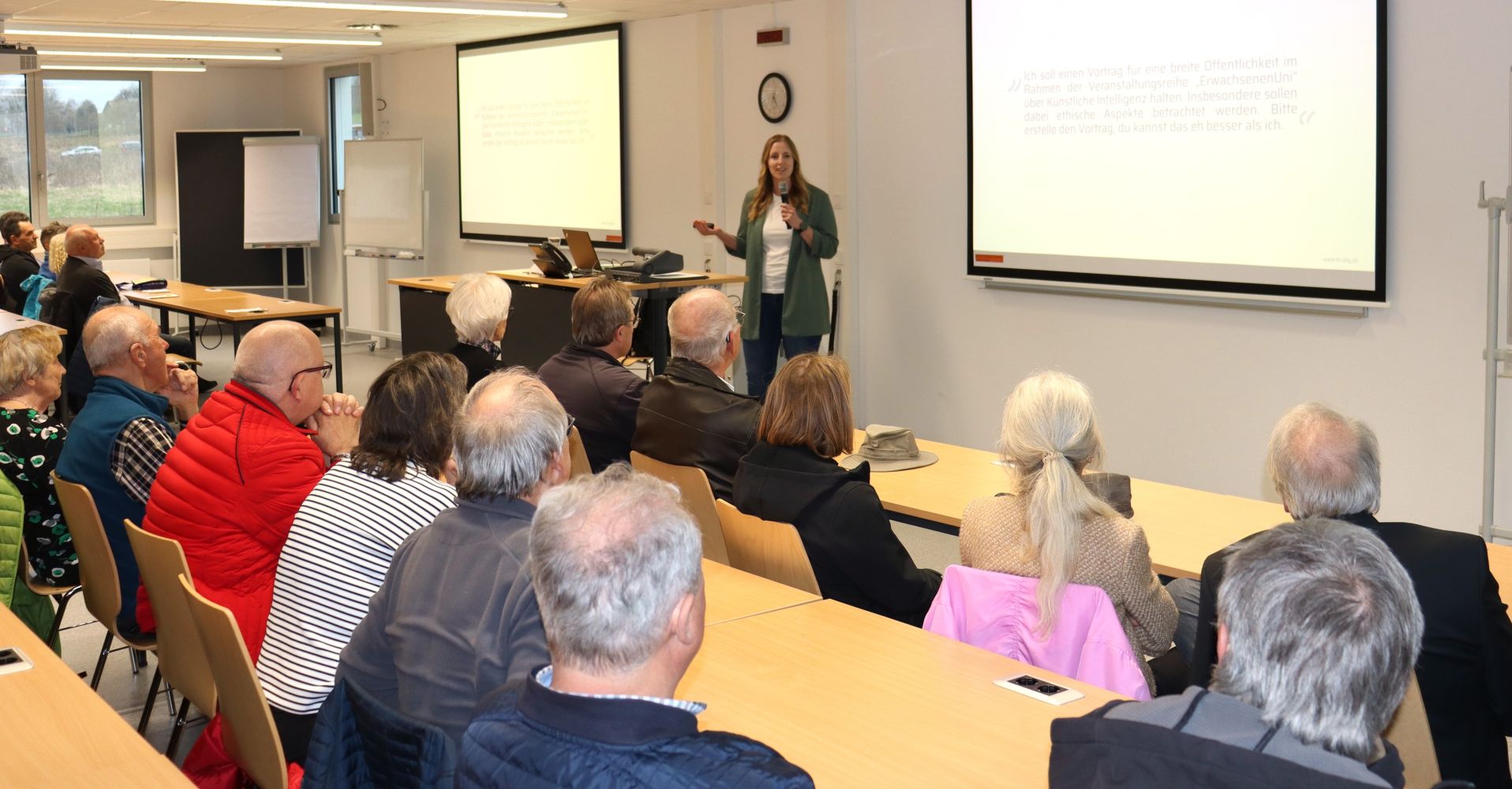 Bild (THD/ECRI): Möglichkeiten und Gefahren der Künstlichen Intelligenz (KI) lotete ECRI-Expertin Bernadette Busler (stehend) bei der kostenfreien Erwachsenen-Uni am European Campus Rottal-Inn in der Max-Breiherr-Straße vor rund 60 interessierten Zuhörern aus.