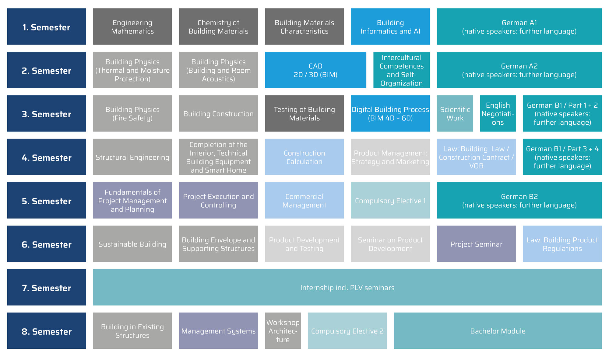 Overview of the courses, Weekly Semester Hours (SWS) and ECTS (European Credit Transfer and Accumulation System) for the programme Bachelor of Engineering in Building Products and Processes.