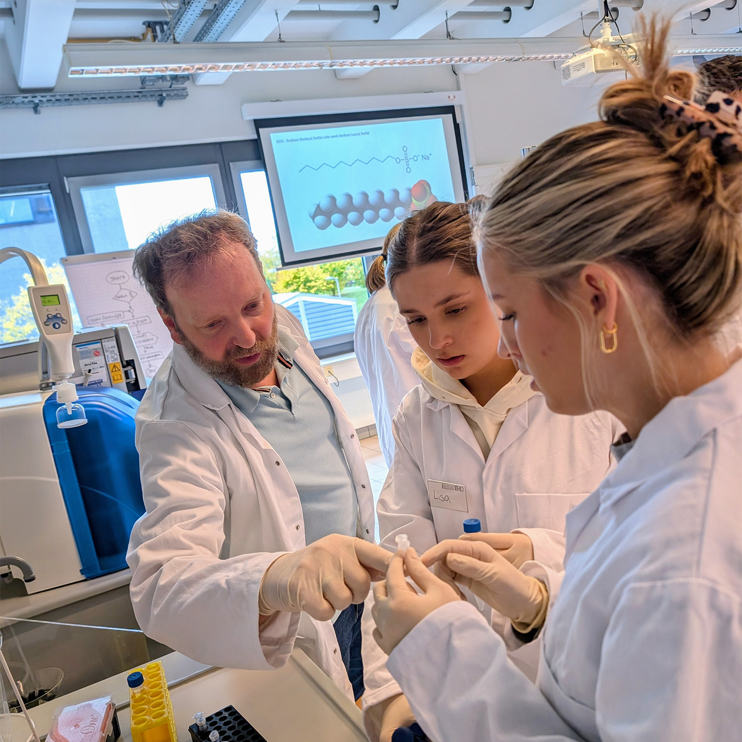 Bild (THD): Zwei Schülerinnen und Dr. rer. nat Stefan Fischer bei der RNA-Extraktion während der Code Week.