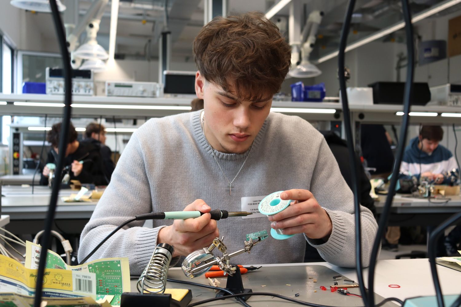 Bild (THD/ECRI): Baute am Campustag im ECRI-Labor einen elektronischen Würfel mithilfe eines Lötkolbens zusammen: Leon Haack (18) von der F11S2 der FOS/BOS Pfarrkirchen.