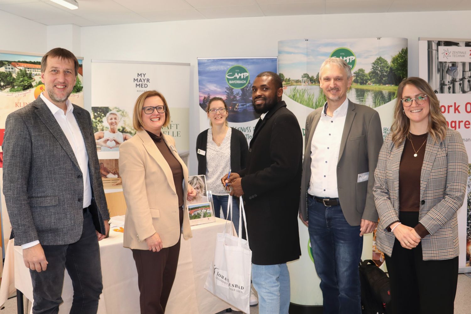 Bild (THD/ECRI): During a tour of the job fair at the European Campus Rottal-Inn (ECRI) of the Deggendorf Institute of Technology (DIT): Mayor Wolfgang Beißmann (from left), Bianka Hallhuber (Rosenhof), Katja Schmidt (Vital Camp), health informatics student Uche Nwachukwu from Nigeria, Dean Prof. Dr. Steckenbauer, and Claudia Probst (DIT Student Service Center).